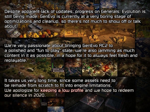 Пользовательский аддон Command & Conquer Generals Evolution больше похож на отдельную игру, чем на очередную модификацию, коих тысячи. Надстройка полностью исправляет проблему совместимости с платформой Origin за счет большего количества хешей. Также здесь устранены неприятности, возникающие с языковыми пакетами. Поправлена механика улучшений для танков типа Скорпион, порезан урон токсических грузовиков – они больше не имба, разносящая все вокруг.