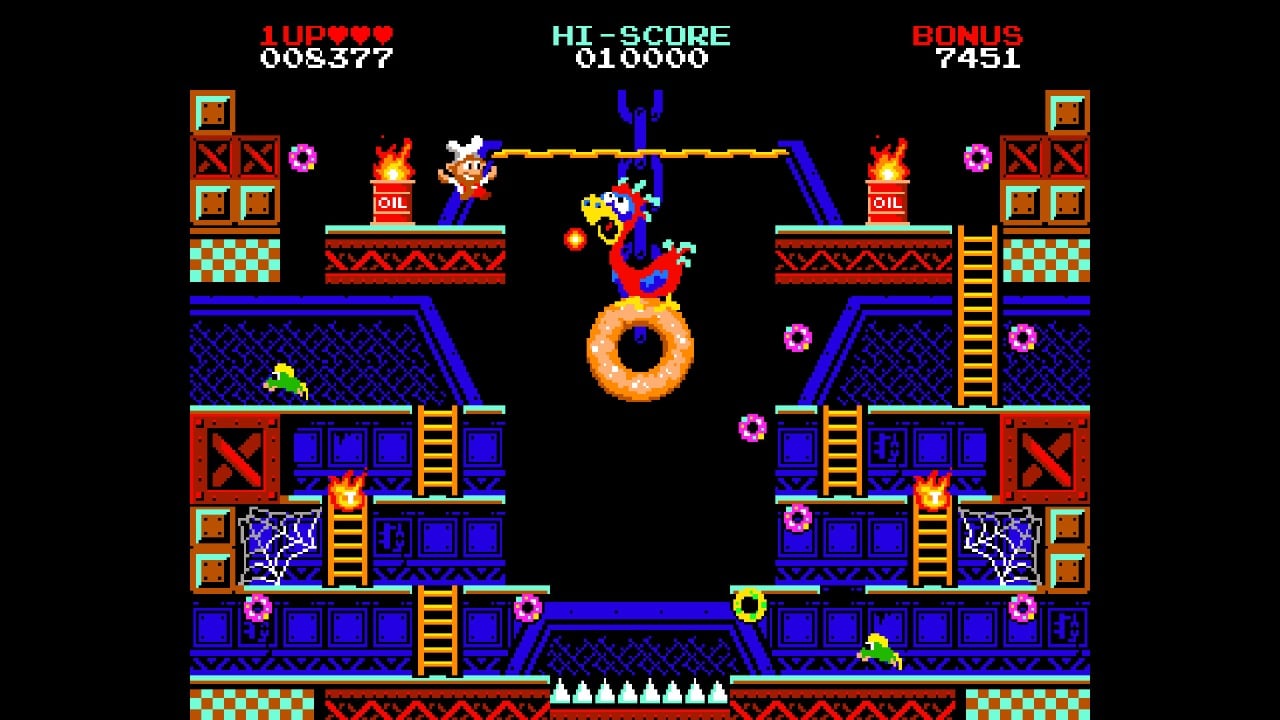 Уровни представлены в одноэкранном виде, где не происходит передвижение камеры. Каждая локация имеет собственные механики, преграды, оппонентов и особенности. Присутствует бонусный этап, открывающийся при завершении основных миссий. Юзеру понадобится привыкнуть к управлению, чтобы успешно преодолевать опасности и собирать пончики. Соотношение сторон выполнено в олдскульном виде, а пиксельная графика имеет 16-цветовую палитру.