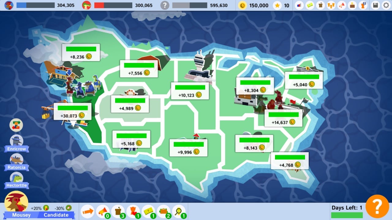 Главный герой может заручиться поддержкой народа, что даст большое преимущество над оппонентами. Для этого потребуется тратить ходы, применяя их на логистику и взаимодействие с жителями. Персонал и сотрудники помогают в решении второстепенных задач, добывают новую информацию, могут стать шпионами или советчиками. Митинга позволят собирать народ и вместе добиваться поставленных целей. Отобранные деньги у богатых позволят потратить их на улучшении рекламы для себя и многие другие полезности.