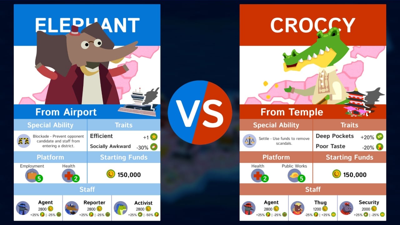 Действие Political Animals происходит на планете с крокодилами, возглавляющими коррупцию, меритократическими мышами и многими другими животными, стоящими у власти. Прохождение сосредоточено на политическом соревновании, где победить коррупцию трудно, если не пачкать руки. В симуляторе избирательной кампании игрок становится участником и будущим мэром, способным сильно повлиять на жизнь горожан.
