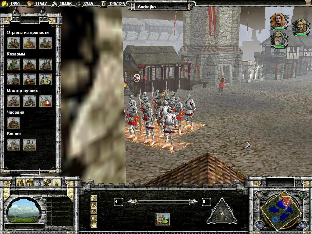 Строениями выступают казармы, кузня, дома каменщика, лесоруба, рудокопа и т.п. Денежный ресурс - золото. Его можно получить при помощи налогов или продажи пива в таверне. Отряды имеют три вида стоек: атакующую, защитную и маршевую. Солдаты могут бегать или ходить. Войска делятся на следопытов, пикинеров, рыцарей, аркебузиров, лучников и арбалетчиков. Также доступны Элитные воины, Монахи и прокаженные.