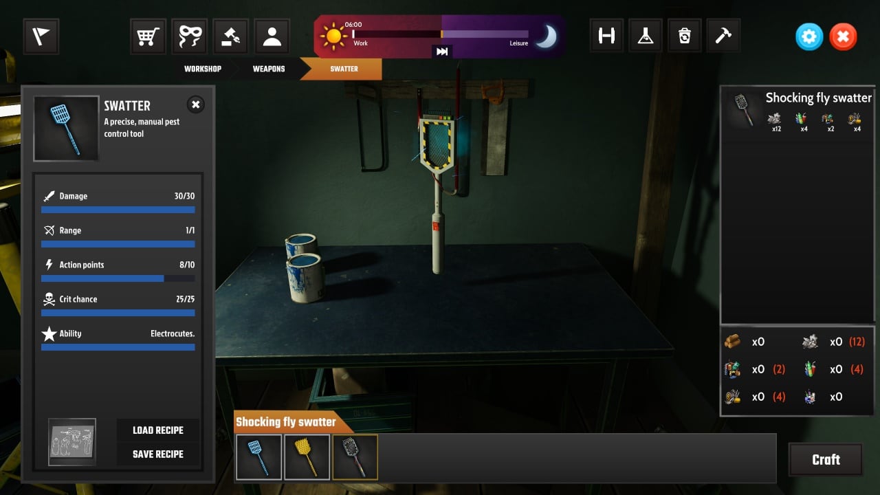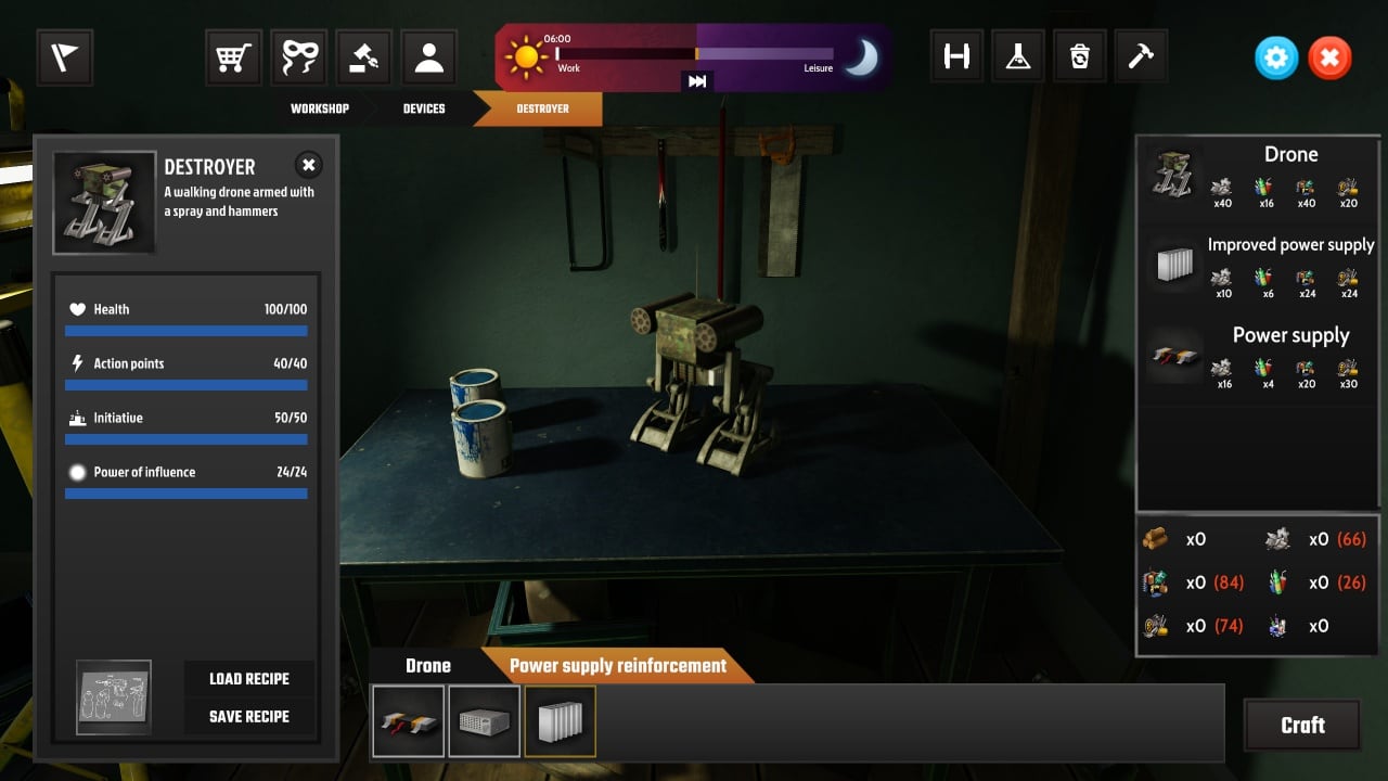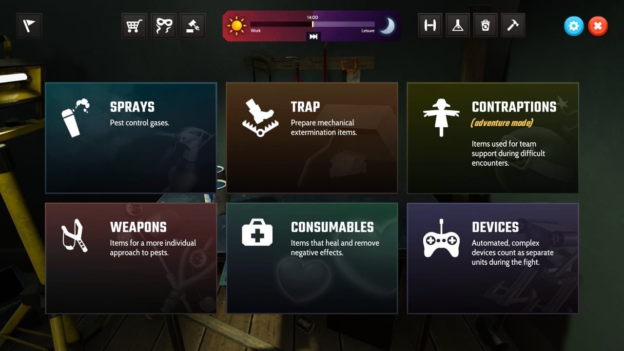 Между работой можно улучшать базу и крафтить предметы. В лаборатории и мастерской протагонист создает оружие, жидкости, разбрызгиватели, инструменты, ловушки и даже маленьких роботов. Необходимые материалы покупаются в магазине или находятся на месте во время выполнения заказов. Персонаж повышает уровни и прокачивается. У него есть 4 характеристики (здоровье, инициатива, шанс критического урона, очки действий) и дерево с пассивными навыками.