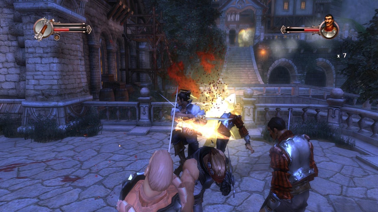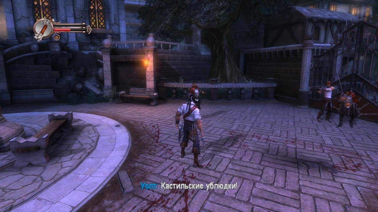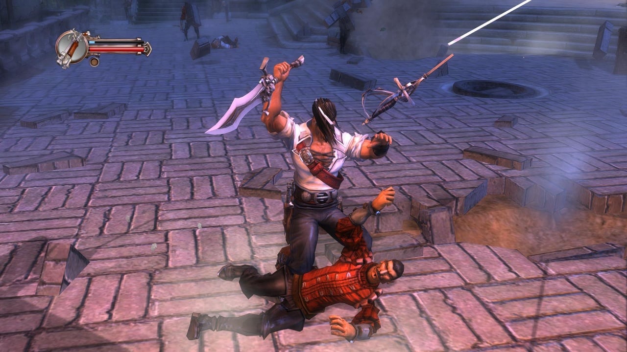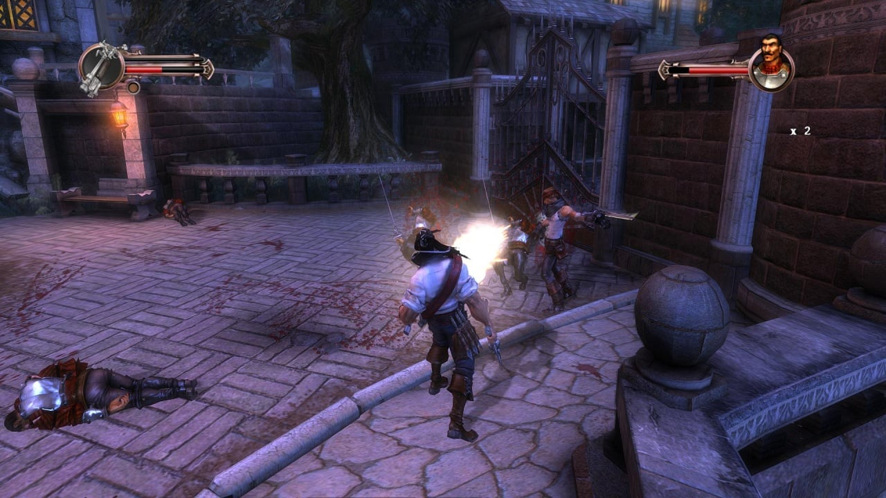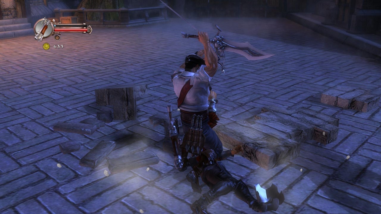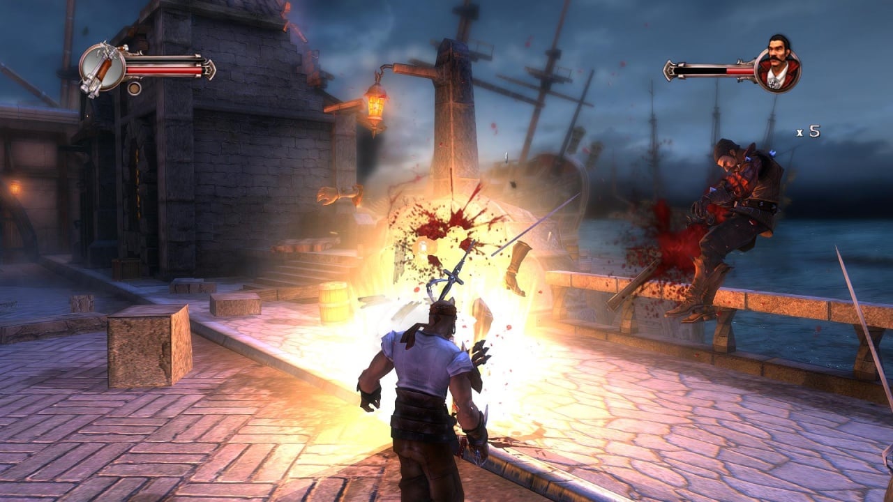 В первом случае игра представляет собой динамичный экшен, завязанный на комбинациях ударов и сражениях с многочисленными противниками. Боевой арсенал Блада состоит из мушкетов, сабель и ножей. Некоторые миссии позволяют переключиться на друга протагониста - героя по имени Питт. Окружение выделяется интерактивностью. Используйте предметы окружения или подбирайте выпавшее из рук противников оружие. Каждый эпизод заканчивается напряженной схваткой с сильным боссом. Все главари имеют свои уникальные паттерны и способности. Представлено множество злодеев из оригинального романа. Один из самых харизматичных антагонистов - Истерлинг. Персонаж по степени проработки не уступают главному протагонисту игры. У Блада есть специальная шкала ярости, при заполнении которой герой переходит в режим ярости, вырезая всех врагов на локации.