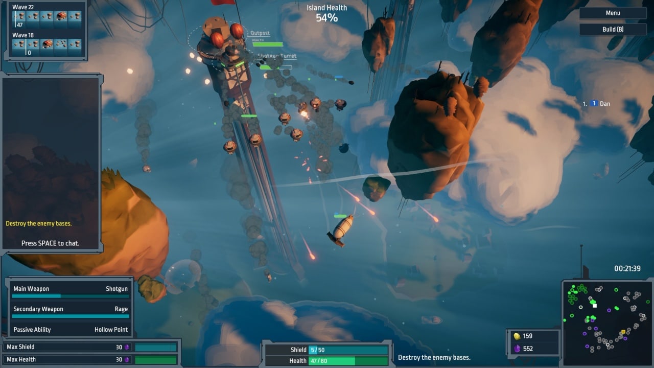 Соберите свой флот при помощи дирижаблей и дронов. Играйте в одиночку или объедините усилия с друзьями, чтобы выступить против общих врагов. Чтобы построить город в облаках, необходимо заняться добычей ресурсов, на основе которых не только возводятся постройки, но и конструируются дирижабли.