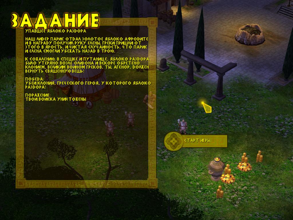 Сама богиня Афродита помогла в похищении. Чтобы отправиться на войну, были собраны ополченцы со всей Греции. Как гласит Илиада, было собрано больше 100 000 воинов и более 1186 кораблей. К ахейцам присоединился Агамемнон - брат Менелая. За Трою выступали такие легендарные личности, как Диомед, Одиссей, Нестор и Ахилл. Выбирайте сторону и сражайтесь в эпических схватках, которые вошли в историю как самые эпичные сражения. Игровой процесс Battle for Troy (Троя) опирается как на исторические факты, так и привносит элементы фантасмагории. Выбрав сторону Менелая, потребуется взять Трою штурмом. Играя за силы Париса, потребуется защищать крепость.