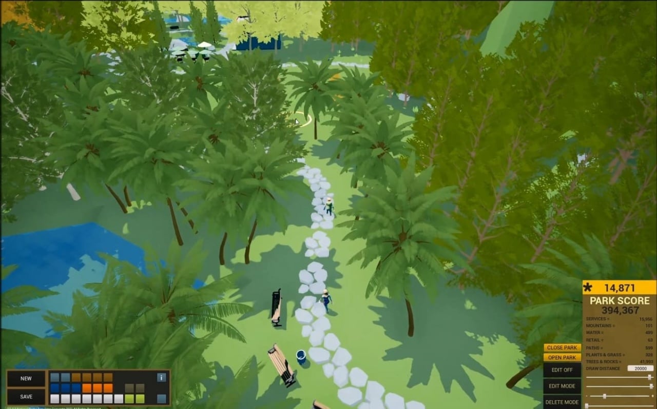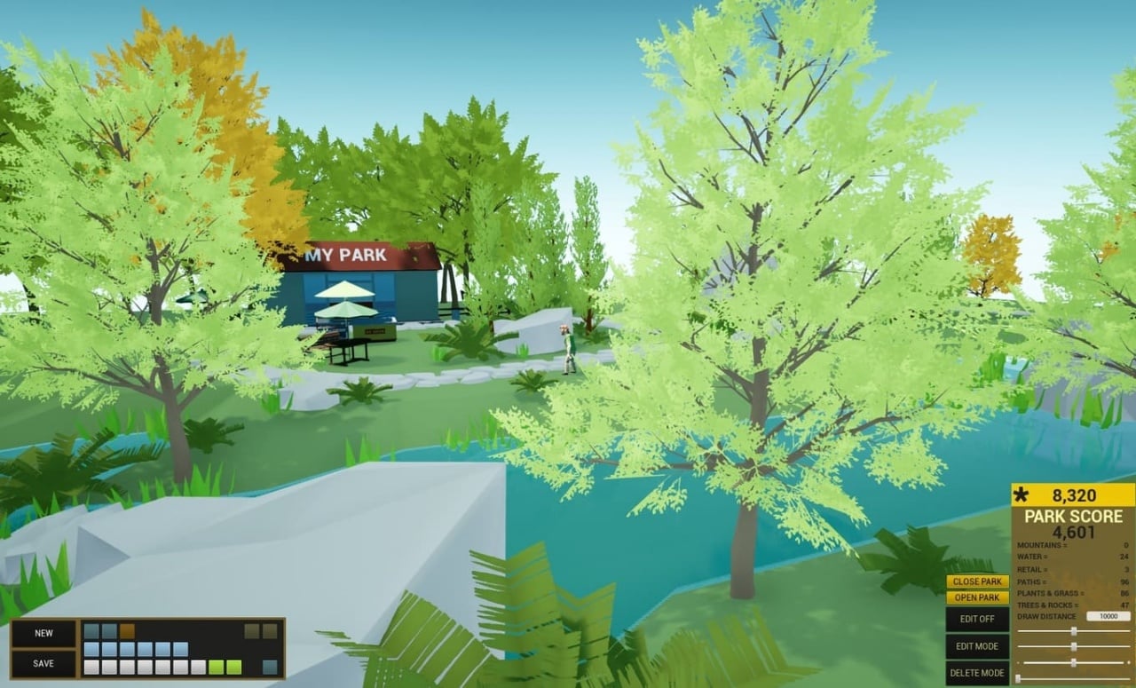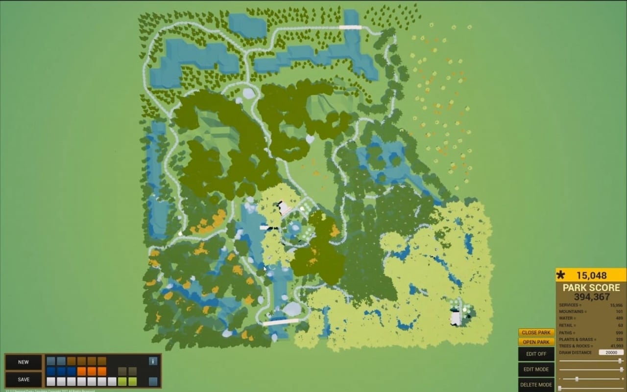 National Parks Simulator – симулятор создания национального парка. Для проектирования местности представлен обширный инструментарий и список устанавливаемых объектов. Прохождение подается в стиле симпатичной и минималистической графики. Пользователю предстоит удовлетворять посетителей, постоянно устанавливая новые места для отдыха, различные буфеты или тропинки. Гости платят за посещение, а деньги тратятся на масштабирование и улучшение бизнеса.
