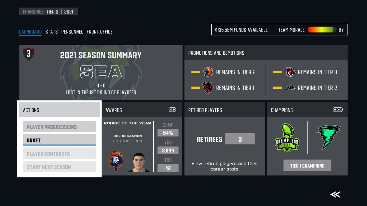 В режиме франшизы представлены контракты игроков, их возможные травмы, разные сделки и места для тренировок. Бесплатное агентство помогает рекрутировать умелых парней, а некоторые из них могут уходить из клуба при желании. Еженедельные и ежедневные награды и испытательные миссии. В процессе имеются 16-недельные сезоны и безмерное количество наград: новые формы, карточки улучшения характеристики и прочее. Юзер способен участвовать в режиме тренера, побывать в роли зрителя, сыграть с другим пользователем или соревноваться с ИИ. Под управление можно взять 1 из 36 команд с отличающимися возможностями.