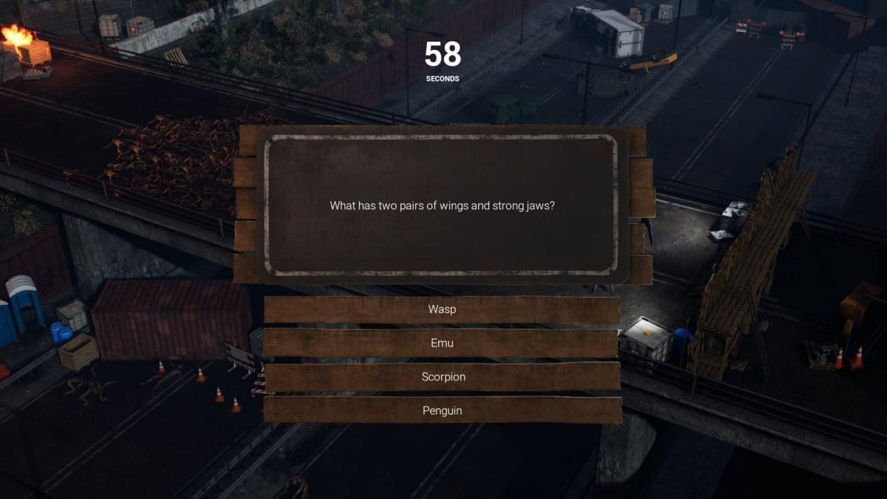 Правильные ответы помогают получить дополнительное время, фугасные гранаты, боеприпасы или разблокировать недлительные бонусы. В настройках можно выбирать темы вопросов, появляющихся во время сражений, количество волн соперников и сложность. Если монстры доберутся до центрального персонажа, то он получит последний шанс остаться в живых в рукопашном бою.