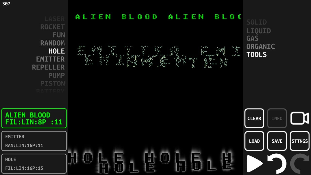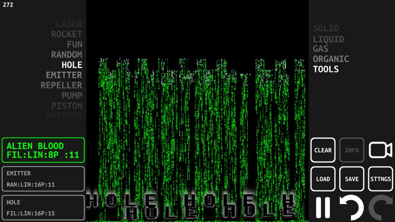 Пользователи могут сочетать эти объекты, как им вздумается, а затем наблюдать за их взаимодействиями и реакциями. Вдобавок можно оказывать на них дополнительное влияние с помощью излучения и различных стихий. Например: ветра. Всё вместе это позволяет геймерам устраивать пожары, взрывы, задымления, а также всячески менять ландшафт. В проекте имеется встроенный редактор, что похож на простые графические программы, позволяющий создавать собственные карты и события. Также есть список заранее созданных уровней. Фон у этапов по умолчанию темный, но можно загружать фотографии и картинки с ПК, а затем использовать их в качестве задника.