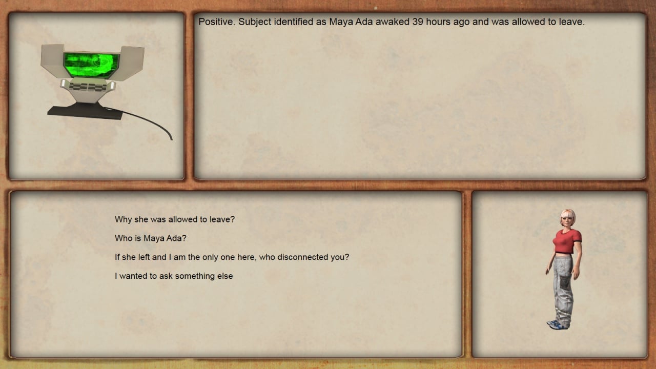 Девушка-протагонист решает разобраться, что вообще тут происходит. Однако ей начинает мешать саботажник. Загадочный незнакомец постоянно вставляет палки в колеса даме, не желая, чтобы она узнала правду. Инди-проект предлагает очень олдскульный геймплей. К примеру, разработчики намерено отказались от "умного" курсора и вернули наследие ранних квестов – панель с действиями. Чтобы взять предмет и положить к себе, нужно выбрать соответствующую команду в меню и только затем наводить мышь на заинтересовавшую вещь. Аналогичным образом проводятся и другие типы взаимодействий с окружением. Игра не показывает, как передвигается главный персонаж. Женщина мгновенно телепортируется при переходе между экранами. Инвентарь отображает одновременно только 5 позиций, но его можно проматывать.