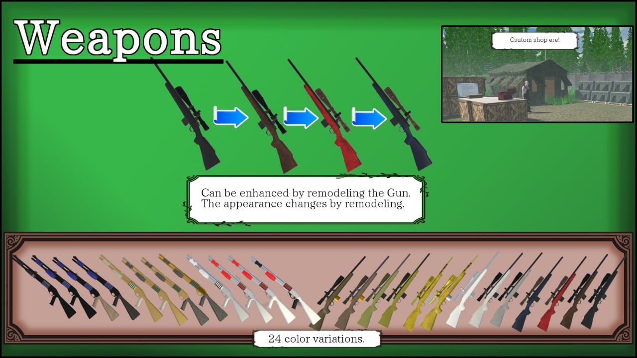 Можно наводиться на мишени через компьютерный прицел, мушку или оптику. Игра поддерживает только клавиатуру и мышь. Управлять стрелком с помощью геймпада в ней нельзя. Помимо отстрела травоядных и хищников можно отыскать на локации спрятанные бочки и пострелять по ним. Всего таких объектов 51. Арсенал представлен дробовиками и винтовками. Пользователь всегда начинает игру с рандомным оружием и случайным количеством стартового капитала. Деньги тратятся на ночлег, покупку костюмов и полезных вещей, вроде прибора ночного видения, а также на приобретение и улучшение пушек.
