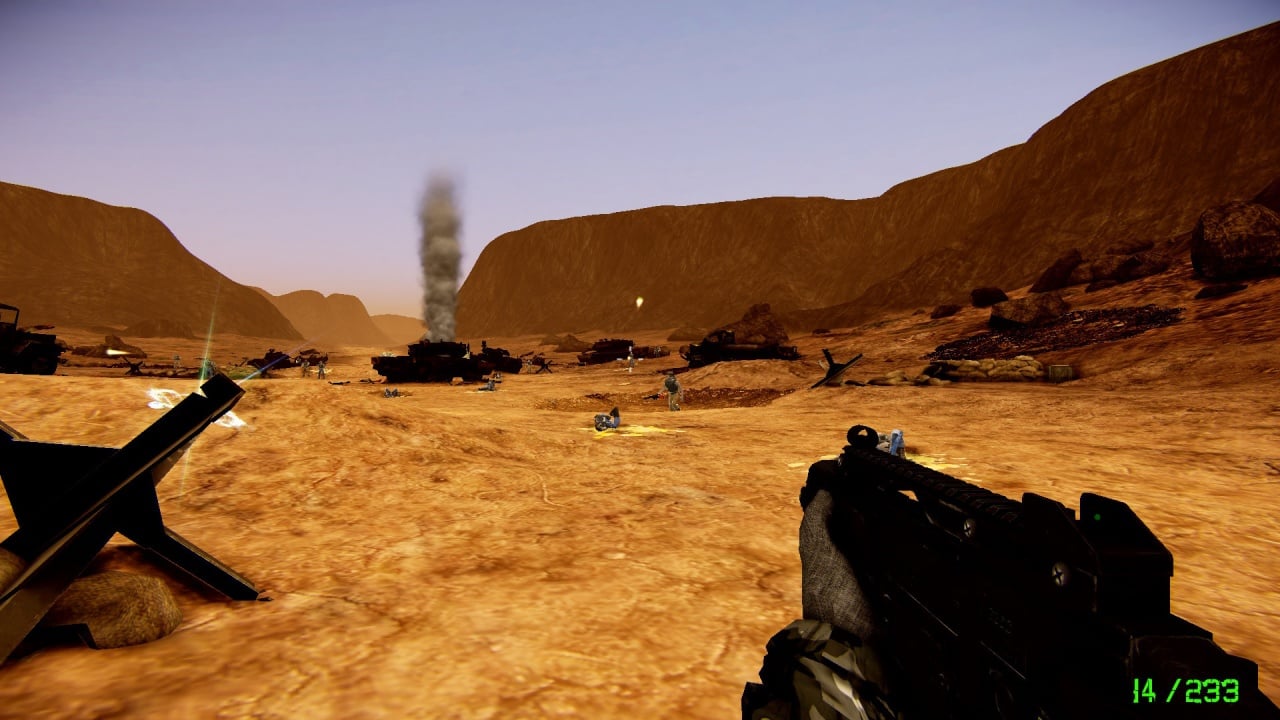 Эта игра сделана одним разработчиком и полностью состоит из готовых ассетов. Но это не главная проблема Cyborg Arena. Настоящим недостатком является отсутствие физической модели многих камней. Это обычные текстуры, сквозь которые можно пройти, и они не задерживают пули, оставляя игрока без укрытия.