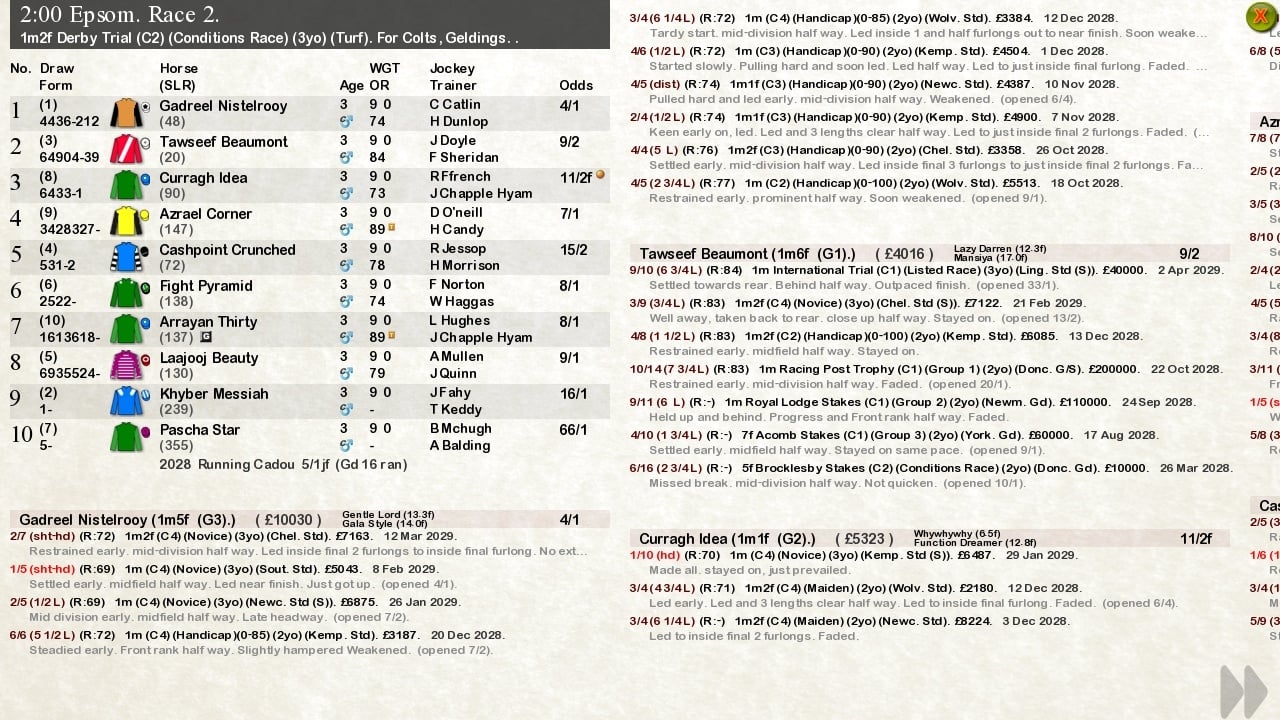 Starters Orders 7 Horse Racing — спортивный симулятор гонки на лошадях, который является более усовершенствованным продолжение прошлой части. Игрок почувствует себя в амплуа владельца нескольких лошадей с маленьким бюджетом, но большими амбициями. Предстоит выбрать страну, которая будет под стать игроку. Посещайте трек, делайте ставки и зарабатывайте финансы, которые сможете вложить в конюшню и улучшение жеребцов. Также можно тратить деньги на покупку новых непарнокопытных, посещая внутриигровой аукцион.