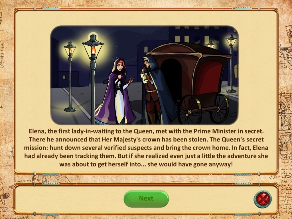 Crown of the Empire переносит геймеров в альтернативную викторианскую эпоху. Главную героиню зовут Елена. Она является очень высокопоставленной придворной особой. К девушке часто обращается сама королева и выдает ей задания национальной важности. Однажды женщина-протагонист отправилась на поиски вора и украденных им из музея Империи символов власти прошлых монархов. Но когда она уже нашла похитителя артефактов в соседнем государстве, то внезапно получила телеграмму от премьер-министра с просьбой срочно вернуться на родину. Сыщица бросила всё и отправилась во дворец. Так начались её новые приключения.