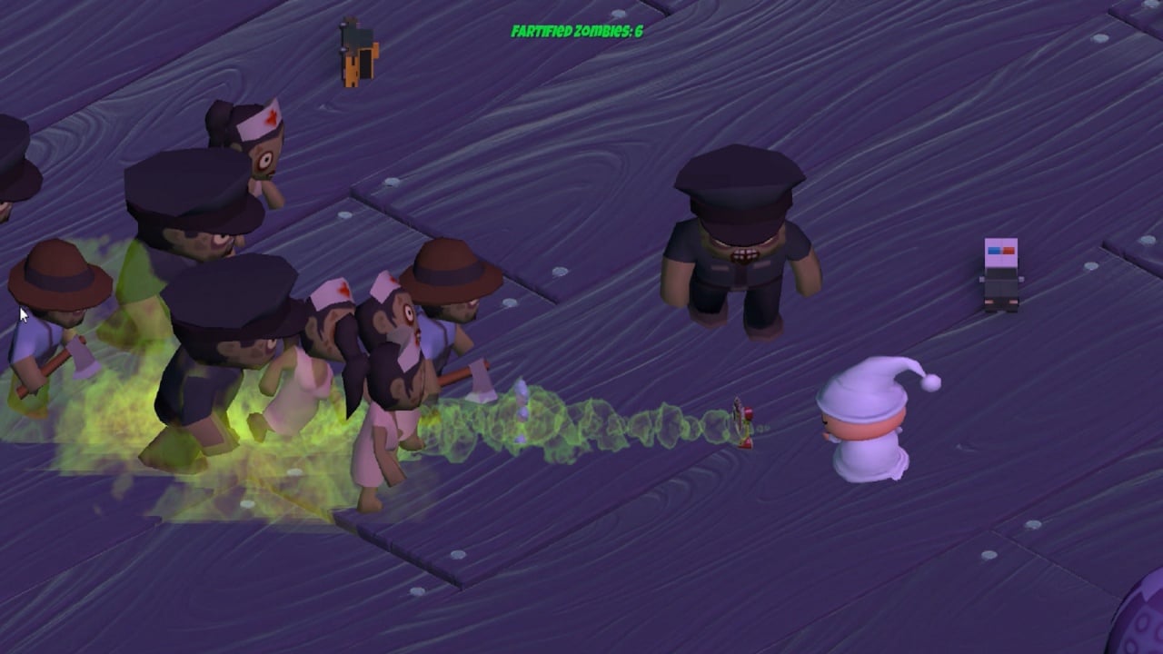 TopDownFarter - лоу-поли экшен, в котором вам предстоит отбиваться от армии зомби, но очень необычным способом. Проблема в том, что живых мертвецов не берут обычные пули. Поэтому потребуется на них пердеть. Как можно понять, какой-либо серьезности от проекта ждать не стоит. Это забавная вариация на тему топ-даун шутеров, которая высмеивает все клише жанра, а также глумится над зомби-выживастиками.
