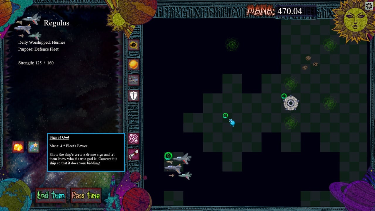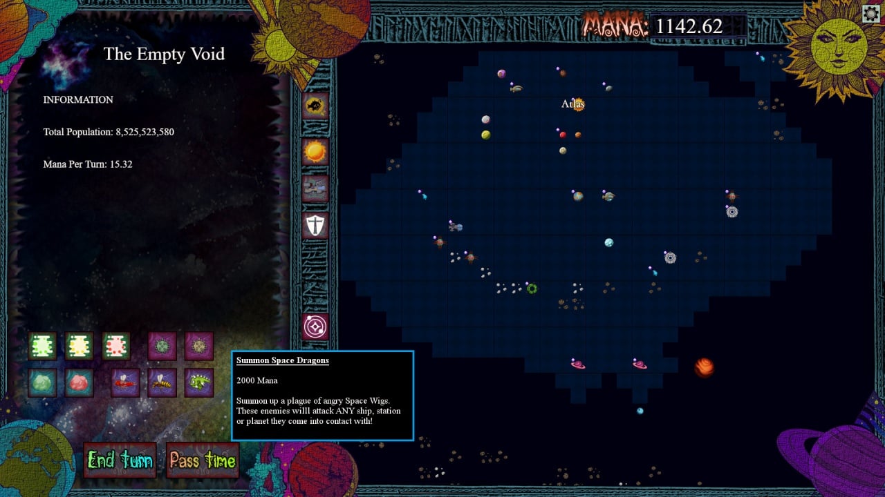 Люди вырабатывают ману – единственный ресурс в игре. Она пополняется с течением времени и ее количество зависит от численности населения в галактике. Эта стратегия основана на движке RPG-Maker. В основе игрового процесса Gods of Havoc: Into the Void лежат ходы. С каждым ходом проходит время и, соответственно накапливается мана. Если ее не хватает для сильного заклинания, пополнить ее можно только ускоряя ходы и ожидая нужного количества. Прохождение может показаться скучным, так как здесь минимум действий и часто приходится просто ждать. Также есть возможность перемотки событий при помощи режима Pass-Time. После этого в журнале появляется соответствующая запись. Иногда при новом запуске игра может подвисать и возникают проблемы с созданием большой карты. В таком случае для закрытия программы нужно воспользоваться диспетчером задач.