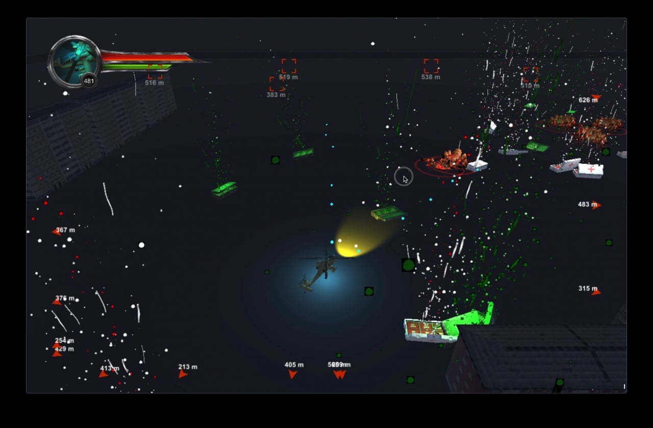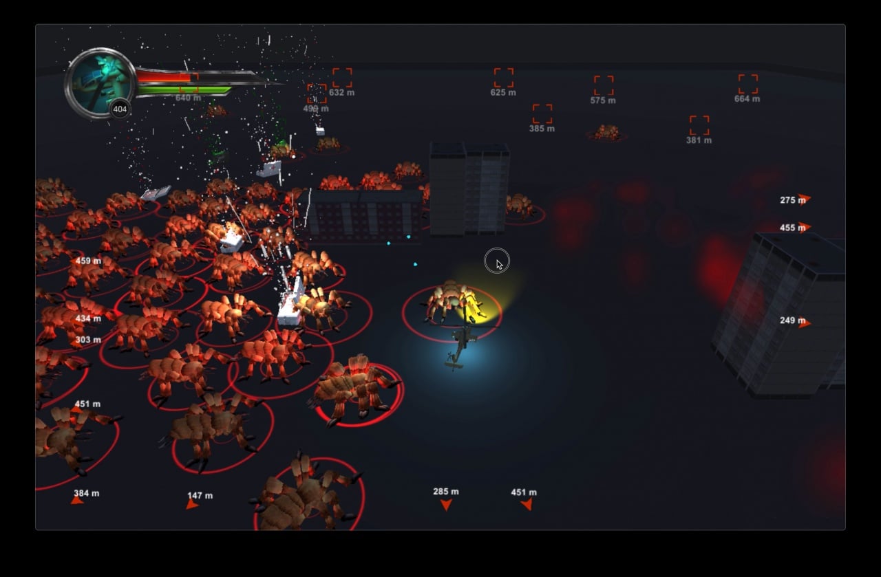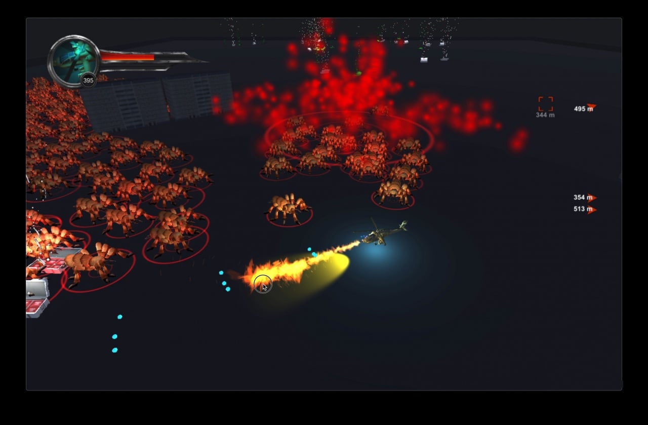 Винтокрылая машина изначально вооружена пулеметом. Он расходует патроны. Амуниция выпадает из убитых недругов. Также некоторые особи оставляют после себя аптечки, что восстанавливают запас прочности. Можно собирать бонусы, чтобы к пушке добавлялись стволы, и она начинала стрелять в нескольких направлениях одновременно. Помимо этого в игре есть огнемет. Он применяется при нажатии правой кнопки мыши или триггера на геймпаде. Схватки с членистоногими хищниками проходят на прямоугольных аренах. Они стилизованы под ночной город, усеянное камнями побережье и т. п. У вертолета есть фонарь, но он никак не освещает территорию.