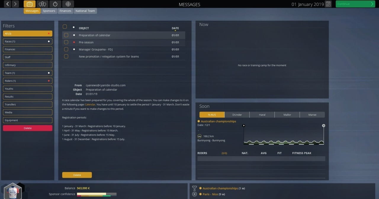 Заботьтесь о тренировках спортсменов и организовывайте их дни. Набирайте новых велосипедистов и заключайте контракты с рекламодателями. Финансовый аспект обладает важной ролью, заставляя эффективно балансировать расходы и доходы. Вы не способны контролировать подопечных напрямую во время матчей. Вместо этого ими управляет искусственный интеллект, а вы планируете стратегии и отдаете приказы, чтобы изменить поведение подчиненных.