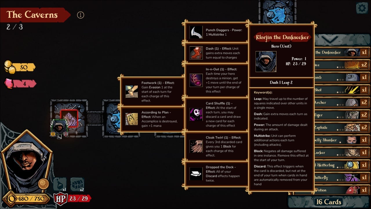 Комбинируя карты и применяя различные тактики, игра будет награждать бонусами и новыми способностями. Исследуя данжи, протагонист находит новые карты и сундуки с золотом. Деньги также падают с поверженных противников. Ветка развития представлена тремя скиллами: хитростью, силой и скоростью. От принятых решений зависит не только исход матча, но и множество других последствий.