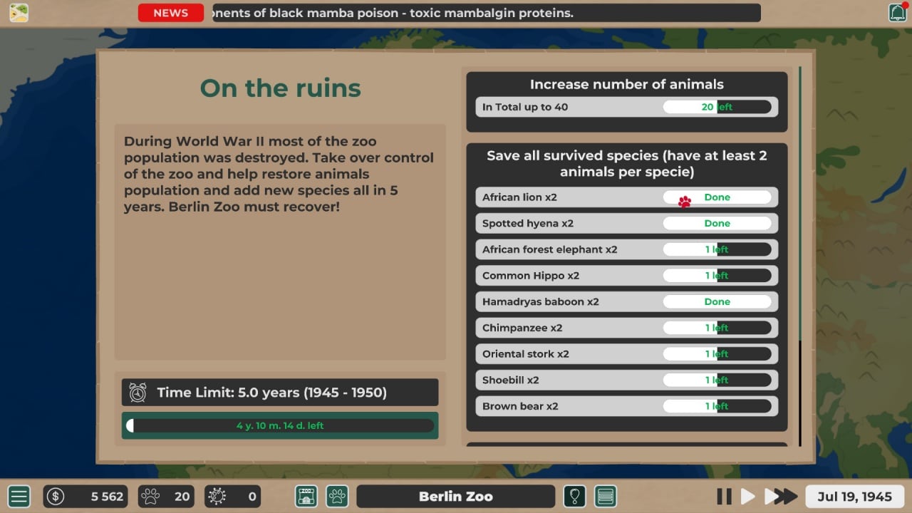 Исторический режим предлагает попасть в Берлинский зоопарк после окончания Второй Мировой Войны, а также даст возможность увидеть события, которые популяризировали киви в Новой Зеландии. Также вам необходимо возглавить экспедицию за первым жирафом, попавшим в заповедник Шонбрунн. Представлено огромное количество случайных событий, генерирующихся рандомно: побег, эпидемия, браконьеры, наводнения и т.д.