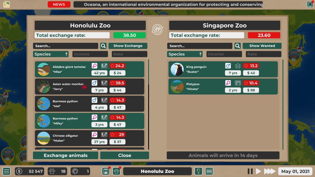 Игра рассказывает о том, как животные появляются в зоопарках. Ответ прост: через обмен. К примеру, как это происходит. Вы находитесь в поисках коалы. Находите ее в Лондоне, нуждающемуся в буром медведе, который есть у вас. Заключайте сделку и обменивайтесь животными. Ищите существ, нужные вам и предлагайте своих редких обитателей, чтобы заинтересовать партнера.