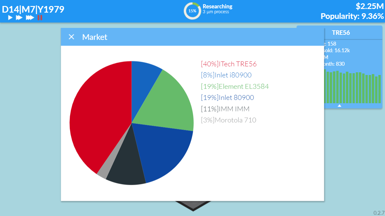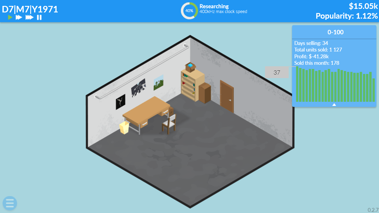 В Hardware Tycoon 4 уровня сложности: легкий, средний, тяжелый и очень трудный. Они выбираются при создании будущей корпорации. Вначале дают придумать название для компании, и ввести имя её генерального директора. Пользователи стартуют в 1970 году. У них есть 50000 долларов и маленькое помещение с минимальным количеством мебели для одного человека. Время можно ускорять, замедлять и ставить на паузу. Проект находится на очень ранней стадии разработки. В сырой версии можно только разрабатывать процессоры, и проводить исследования в этой отрасли. Игра позволяет при создании CPU подписать сам бренд и назвать как угодно текущую линейку чипов, определиться с частотой, сокетами, количеством ядер и общим качеством сборки, выставить цену для конечного потребителя. Чем круче должен оказаться продукт, тем дороже обойдется процесс его разработки, создания и производства.