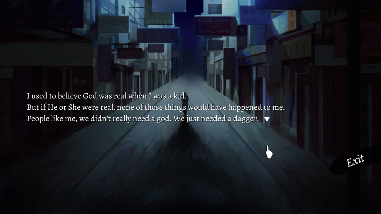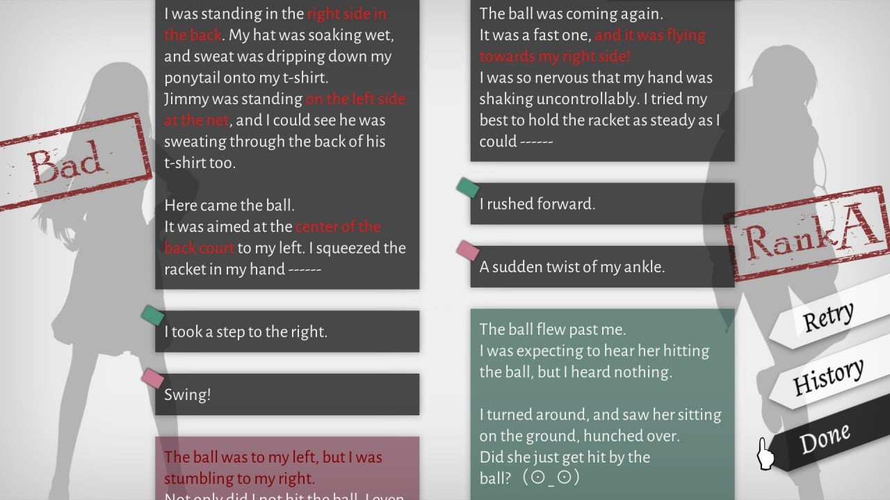 В основной истории чередуются милые, юмористические и очень мрачные эпизоды. Инди-проект рассчитан на взрослую аудиторию, поскольку в его сюжете есть текстовые описания убийств, расчлененки, различных форм насилия (в том числе и сексуального характера), надругательств над детьми, опытов на живых людях. Иногда шокирующие моменты сопровождаются соответствующими звуками и изображениями с каплями крови. Ход подобных событий тут можно изменить.