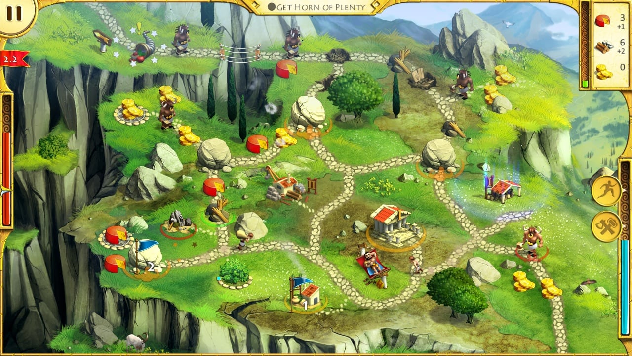 Хозяин лежит в гамаке и вспоминает о своей жене, а вот рабочим предстоит нелегкая работа. Им понадобится сооружать фермы, копать шахты для добычи золота, крафтить стройматериалы, прокладывать дороги и мосты. Вот только когда мужички валятся с ног от проделанной работы, Геракл сам идет доделывать свой подвиг и становится легендой. В процессе представлен тайм-менеджмент, чем меньше времени потратит геймер, тем больше шансов, что он получит все звезды за прохождение.