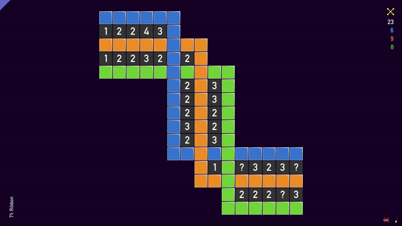 Юзер видит перед собой поле произвольной формы, разбитое на разноцветные квадраты или гексы. Когда пользователь нажимает на одну из ячеек, то на ней появляется цифра. Она демонстрирует, где поблизости (на смежных кубиках или гексагонах) может быть бомба. За пределами сетки тоже есть числа. И они показывают точное количество ловушек, что скрыто в конкретном столбике или строке. Также геймеру позволяют узнать и подсчитать количество взрывоопасных объектов каждого цвета. С помощью сразу трех разновидностей подсказок игрок полагается только на свой ум. Для решения загадок надо открывать безопасные участки карты, стараясь не подорваться. Влияние рандома на каждый пазл отсутствует.