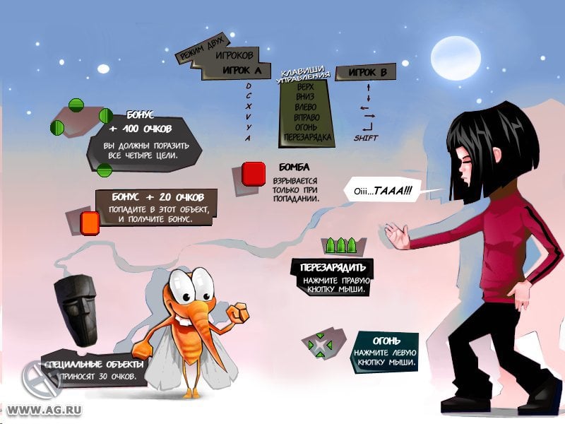 Чтобы убивать кровососов, нужно задействовать левую кнопку мыши. Любой комар, который умудрится достичь цели, выпивает немного крови. У вас есть параметр крови и вам всячески необходимо сохранять его на приемлемом уровне. Как только кровососам удастся осушить "живой сосуд", игра будет проиграна и предстоит начинать все сначала.