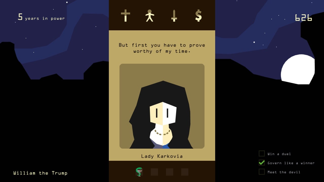 Пользователь предстаёт в виде владыки государства, ему предстоит принимать множество, стоящих решений именно они и будут нести за собой большое количество неординарных последствий. Игроку не нужно выполнить ничего лишнего, только следовать указаниям и исполнять те или иные задачи. Целью игры, будет удержать свою власть любыми методами, а здесь это сделать очень и очень непросто. Придётся идти на разные хитрости, обдумывать и принимать правильные решения, иногда они могут быть очень лояльными, а иногда и вовсе печальные для всех, а также постоянно придется находить разные ресурсы, чтобы прокачиваться своего правителя. Основными аспектами игры – это карточный вид. В каждой карте скрыт свой смысл и особое значение. Карты будут вашими путеводителями на протяжении всей игры. Вам придётся выбирать где и как выбрать нужную карту.
