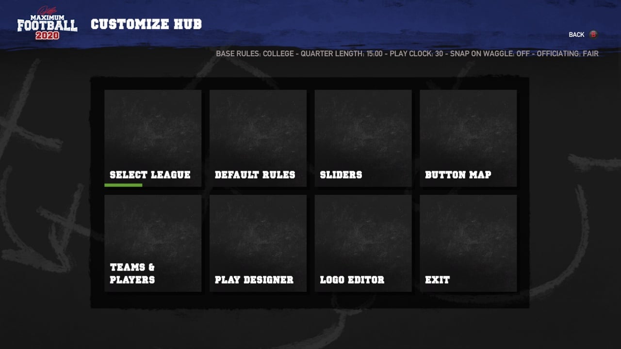 Режимы Play Now и Season Mode включают 32 лицензионные команды с полной настройкой и кастомизацией спортсменов. Выбирайте логотипы, цвета формы, экипировку и т.д. Предоставляется возможность выбора разных правил, полей и лиг, среди которых Американская профессиональная лига, Колледж или Канадский футбол.