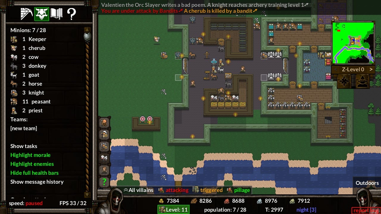 KeeperRL - симулятор с элементами рогалика, в котором предстоит строить подземную базу и развивать общество. Вы играете за могущественного волшебника, обучающегося черной магии. Обучайте миньонов военному делу, заставляя нападать на мирных жителей поселений, забирая их пожитки и сжигая дотла дома.