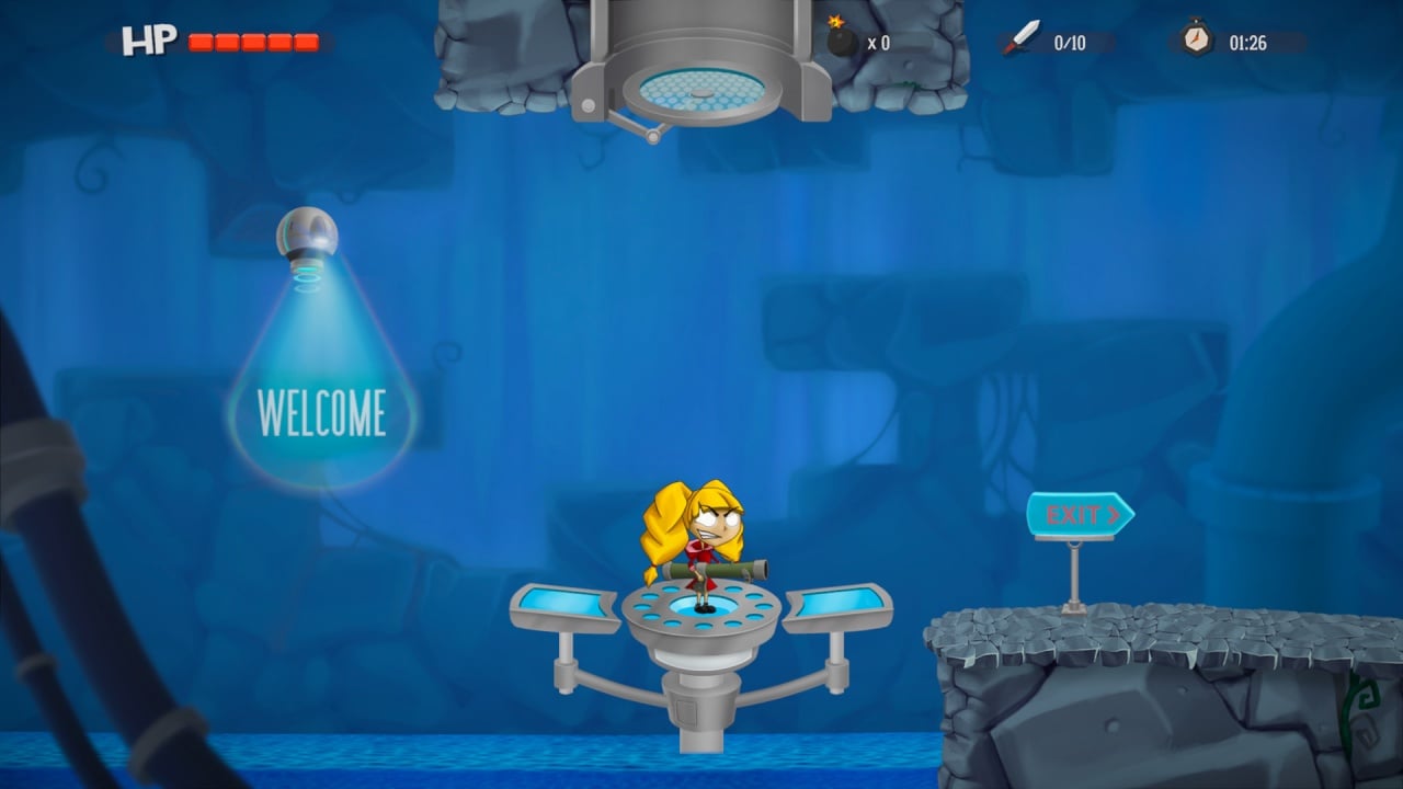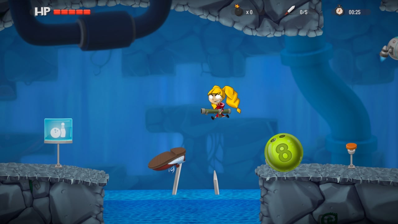 На интерфейсе вы заметите количество здоровья и время, за которое проходите текущий уровень. На локациях разбросаны бомбы и метательные ножи. Всего можно носить по 8 второстепенных предметов каждого вида. Они помогают сражаться с врагами или уничтожать объекты. Если вы надолго застряли на определенном задании, то можете воспользоваться подсказкой, а их ограниченное количество. Спуститесь в подземную лабораторию и морское царство. Выберитесь наружу, преодолевая бездонные пропасти, лазерные ловушки, шипы или роботов-противников.