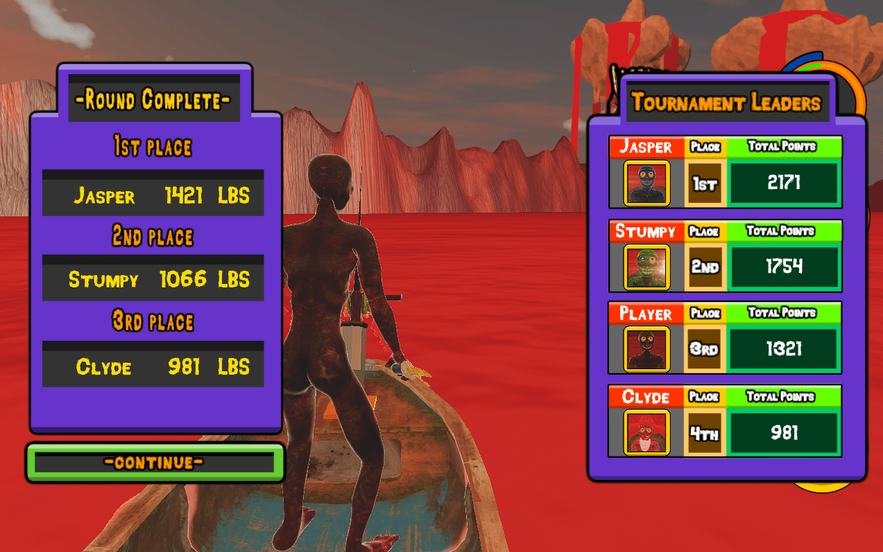 Nightmare Fishing Tournament 3D – это достаточно мрачный и необычный рыболовный симулятор. Пользователь управляет человеком с полностью обгоревшей или содранной кожей. Этот персонаж падает в гигантское кровавое озеро. Там его находит управляющий лодкой скелет в балахоне, похожий на Харона из древнегреческой мифологии. Он предлагает проклятой душе поучаствовать в рыбацком соревновании. Если герой выиграет, то сможет вернуться в мир живых, а если проиграет, то попадет в Ад. Новый знакомый безымянного протагониста продает ему различные товары.