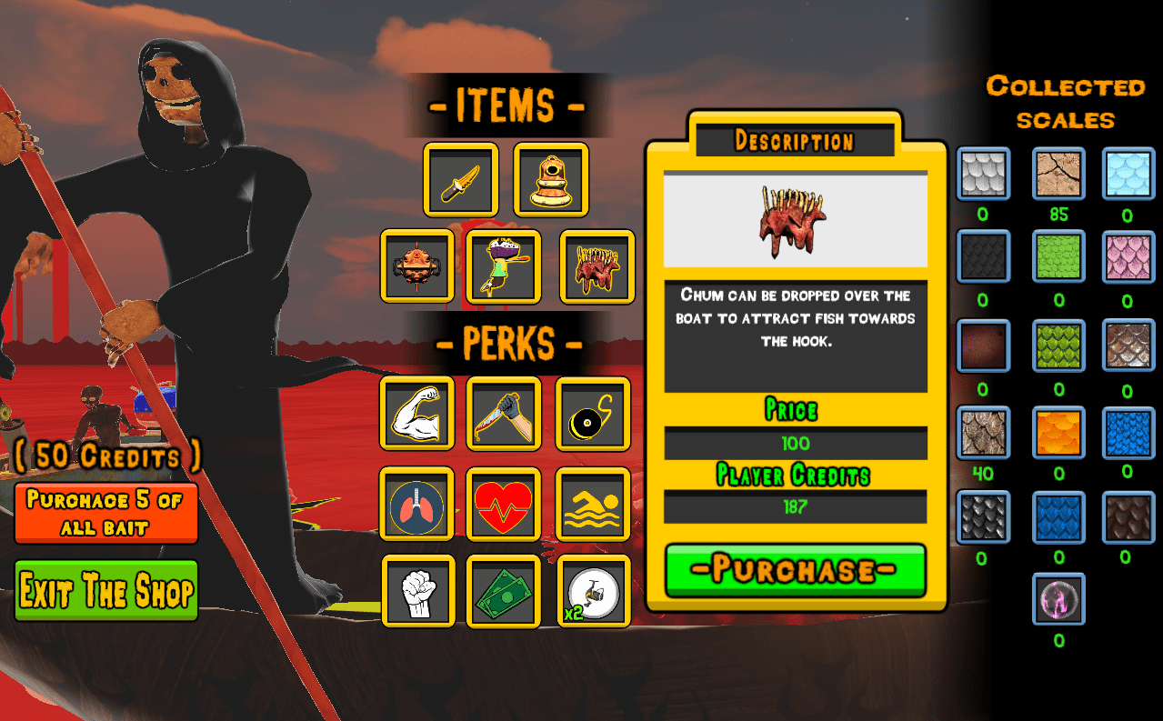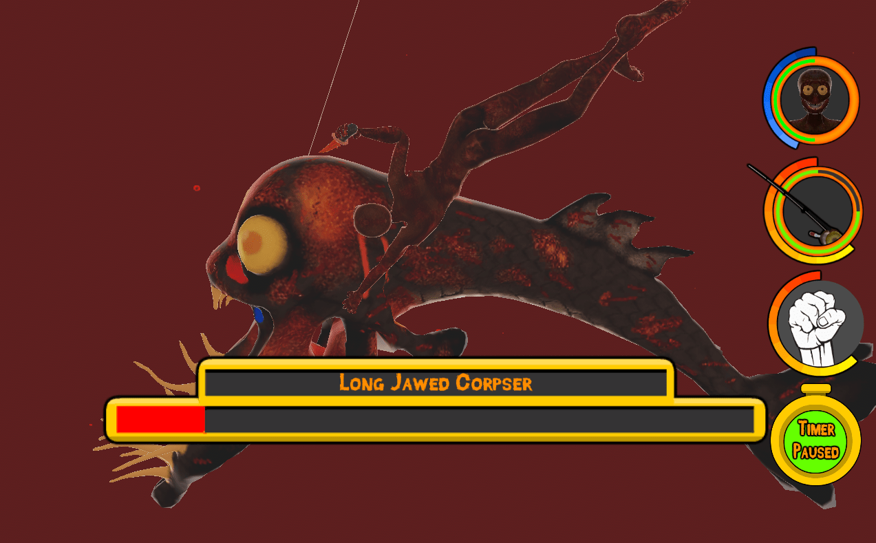 Геймплей выглядит следующим образом. Персонаж, находясь в лодке, забрасывает удочку и ждет, пока одна из рыб клюнет. В случае успеха он ныряет под воду и начинает кромсать ножом обитателя морских глубин. Во время сражения надо помнить о запасе кислорода. Цель битвы состоит в том, чтобы оглушить жертву. После этого рыбак залезает обратно на судно и начинает затаскивать монстра на борт. Добычу можно отправить на турнир или же продать скелету. На заработанные деньги юзер может прокачивать своего протеже и покупать для него перки или более мощную экипировку.