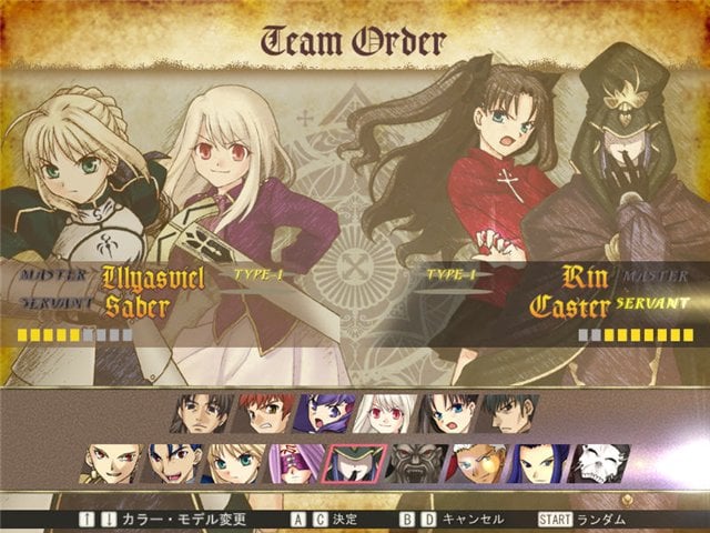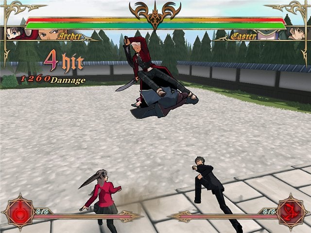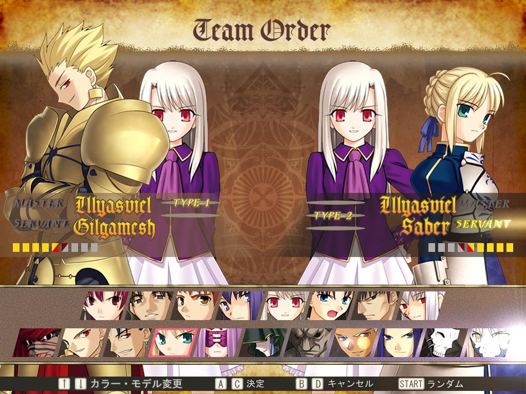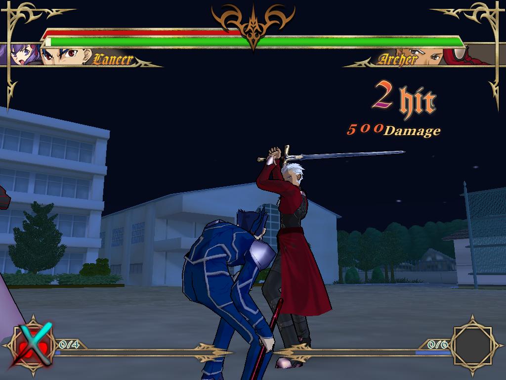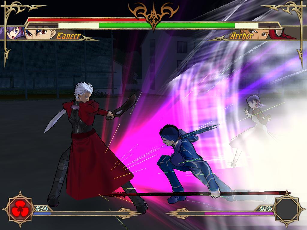 В остальном файтинг следует всем канонам жанра. Вы сражаетесь против соперника на обширных боевых аренах, используя несколько видов ударов, захваты, суперспособности и т.д. Доступно 2 шкалы. Одна отведена на здоровье, а другая на энергию. Представлены знакомые по манге или аниме персонажи, среди которых Сэйбер, Арчер, Лансер, Райдер и другие, представляющие Слуг, а также Хозяева, такие как Рин Тосака, Сиро Эмия и т.д.