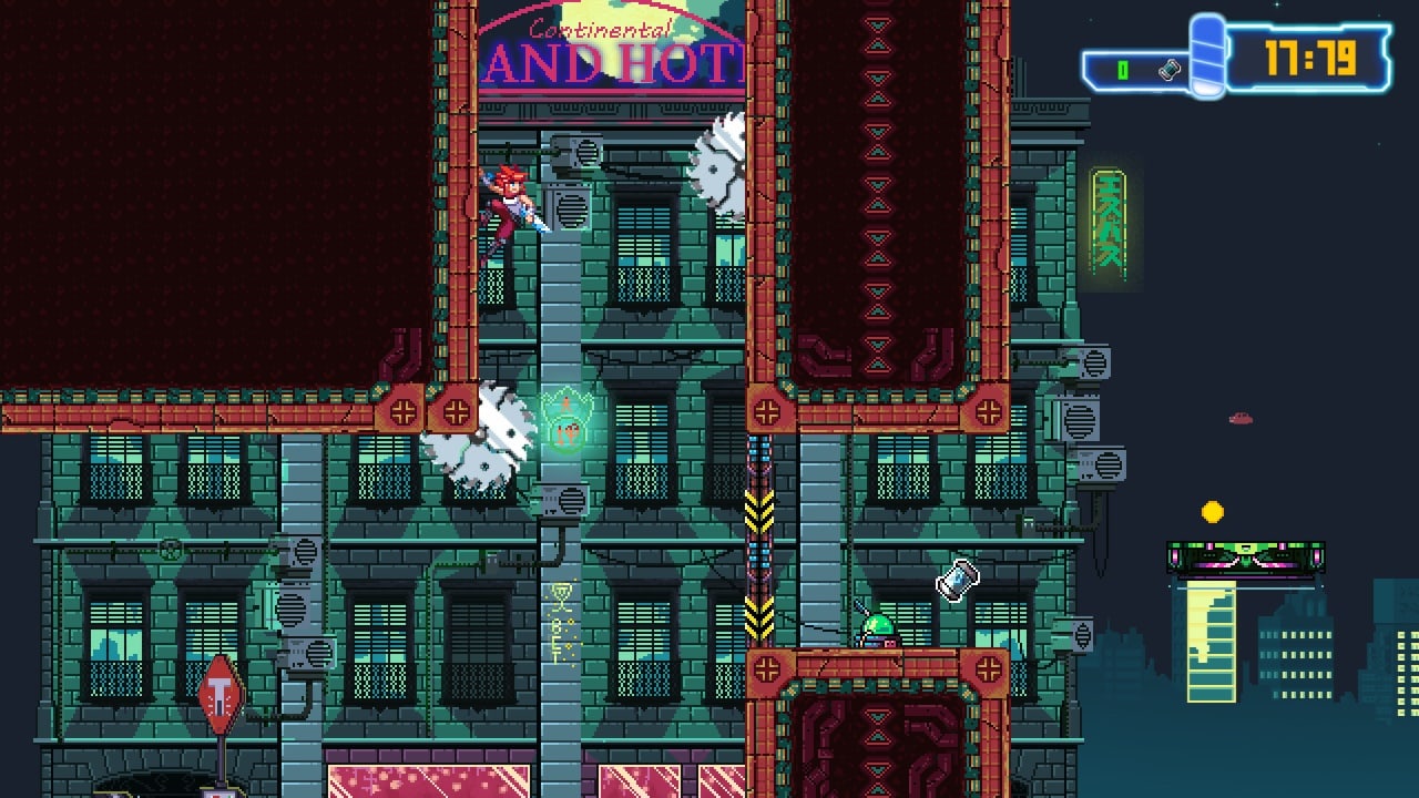 Стоящих на пути врагов женщина-протагонист рубит огромным мечом под ретровейв. Им же она уничтожает разрушаемые препятствия. Ещё у неё есть телепортационный кинжал. Он работает по следующему принципу: сначала девушка бросает нож, а затем, спустя мгновение, этот предмет переносит её к себе. С его помощью можно преодолевать большие пропасти и проходить сквозь определенные преграды, включая узкие проходы. Ещё шустрая героиня может прыгать, отскакивать от стен и скользить по ним. Также она способна искажать время, напрямую влияя на таймер и добавляя себе дефицитные секунды. Однако это умение надо регулярно перезаряжать, подбирая специальные капсулы.