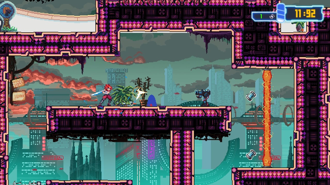 Aeon Drive – это динамичный экшен-платформер в сеттинге киберпанка. Основной упор в нем делается на скоростное прохождение уровней (всего их 80). Для прохождения этапа нужно добежать до конца карты до истечения таймера. Есть не успеть, то забег по локации придется начинать заново. Есть таблица лидеров, где подсчитывается затраченное время, количество убитых противников, собранные деньги и найденные алмазы.