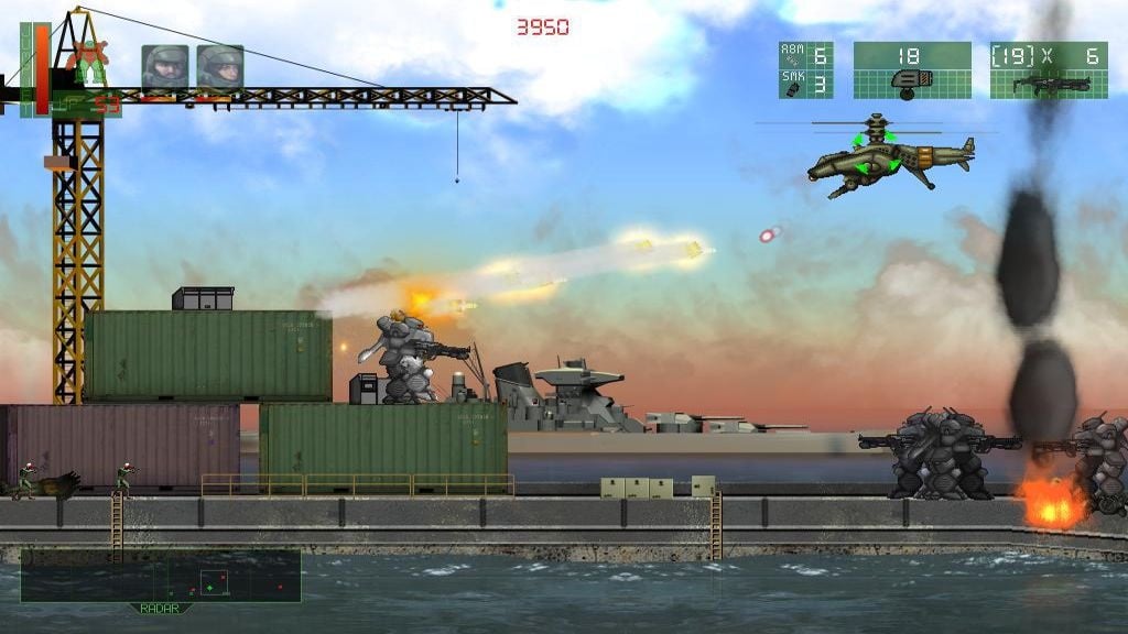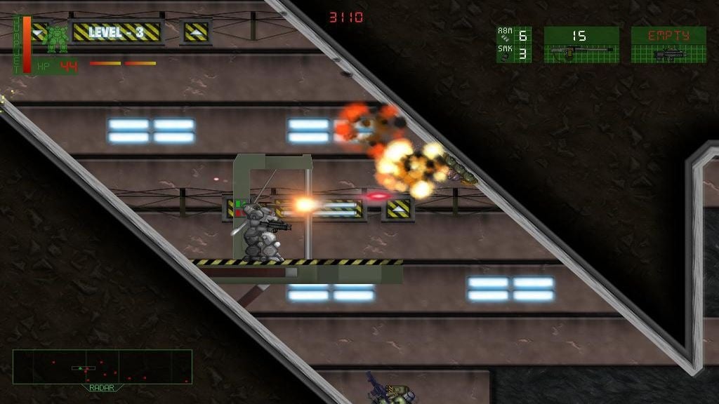 В этом проекте 16 уровней, не считая обучающей локации. После завершения этапа подсчитывается рейтинг геймера. Для уничтожения противников доступен арсенал из 17 типов вооружения. Пушки открываются постепенно. Стволы требуют патроны. Если не следить за амуницией, то потом будет нечем атаковать обычных противников или боссов. У робота есть полоска HP. Она медленно сама восстанавливается.