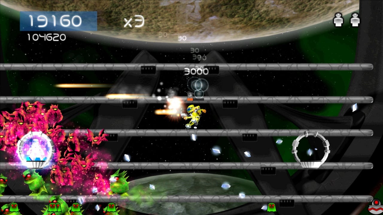 Игра является экшен-платформером с видом сбоку и предлагает геймплей старой школы. Герой бегает по многоэтажным аренам с препятствиями и уничтожает появляющихся со всех сторон монстров. Он может подниматься на этаж выше с помощью джетпака, а также спускаться вниз. Персонаж вооружен достаточно скорострельным бластером. Можно подбирать временные усиления, что позволят недолго стрелять сразу тремя пулями в разные стороны, наносить больше урона, выпускать самонаводящиеся ракеты, выжигать всё лазером. Этап считается пройденным после зачистки поля боя от всех чудищ. За убийство пришельцев-зомби дают очки. Выпадающие из них кристаллы увеличивают множитель.