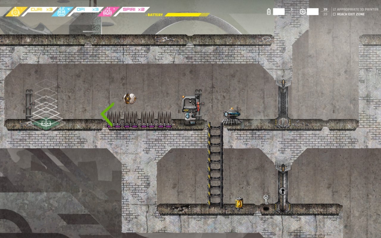 Переключайтесь между героями в любой момент, играя в одиночную кампанию, либо же объедините усилия с двумя друзьями, запустив игру в режиме локального мультиплеера. Каждый из героев в Terraforming Earth имеет свои особенности. Опи перемещается на гусеницах и создан для тяжелой физической работы. Кури исследует местность и может взлетать на небольшую высоту. Спири умеет телепортироваться через тонкие стены.