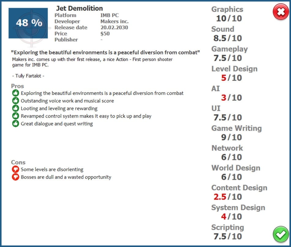 Геймплей напоминает Game Dev Tycoon. Вкратце концепция выглядит так: строим офис, нанимаем сотрудников (до 26 человек с различными специализациями), создаем видеоигру, выпускаем её на выбранной платформе. А затем читаем обзоры и оценки от прессы, извлекая пользу из критики для будущих проектов. Здесь есть аналитика, прокачка главного персонажа и его коллег, соперничество с конкурентами, покупка других студий, обучение сотрудников, а также больше количество механик и событий. Релизнувшаяся игра может "прострелить" или провалиться в продажах, выиграть различные награды, попасть под запрет в определенных странах и т. п.