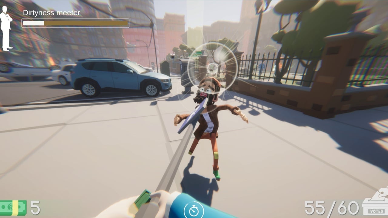 Мы играем за политика, что пытается заручиться поддержкой населения. В Election simulator вместо огнестрельного оружия используется валюта. Из арсенала есть пачки купюр, свиньи-копилки с монетами внутри и чемоданы денег. С их помощью антигерой расстреливает прохожих, пока те не превратятся таких же, как он сам. Можно также вести огонь по сломанным лавочкам и другим объектам, требующим починки. "Патроны" пополняются у банкоматов. Шкалы здоровья тут нет. Её заменяет полоска "грязи". Стоит избегать неподкупных людей, чтобы не "запачкаться".