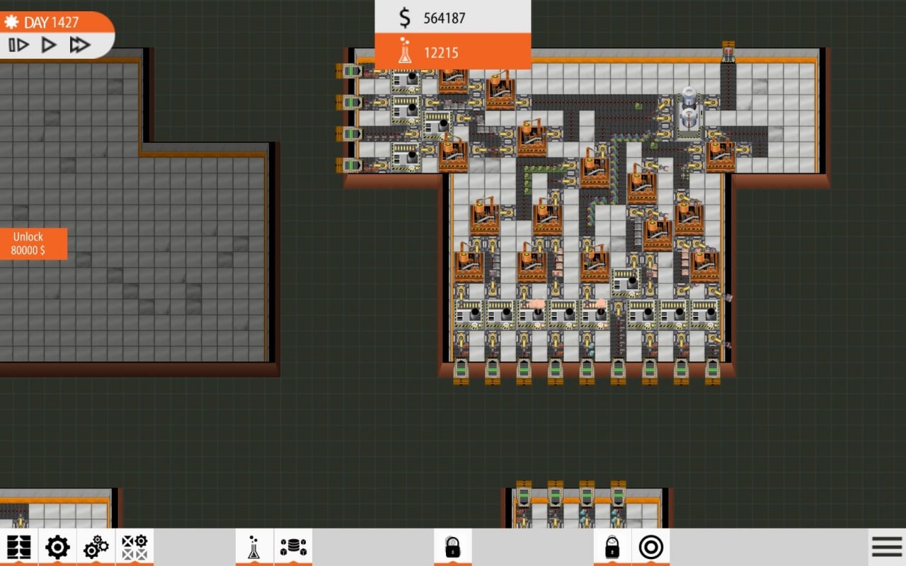 Производственные цепочки налаживаются с помощью конвейеров и манипуляторов. Доступно 20 машин. Размещать их приходится на ограниченной области. Дополнительные участки надо покупать на вырученные деньги (цены кусаются) и затем соединять между собой. Крафтить можно 70 предметов. Процесс их создания усложняется по мере прохождения. Более сложная продукция приносит больше выручки. Также в игре есть механика вторсырья и технологическое дерево. Там постепенно открываются новые улучшения и товары.