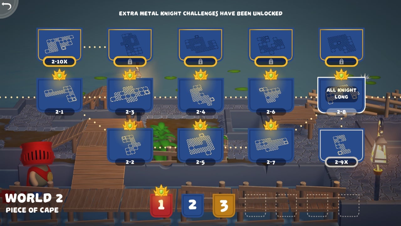 Puddle Knights - головоломка, предоставляющая вам возможность управлять рыцарями в змееподобных накидках, которые прокладывают дорогу королеве или епископу. Вам необходимо закрывать плащом лужи, грязь и различные препятствия. Необходимо провести дворян из точки А в точку Б, минуя все опасности, предоставляемые локациями. Прохождение кампании может занять от 10 до 30 часов времени, в зависимости от скорости решения головоломок.