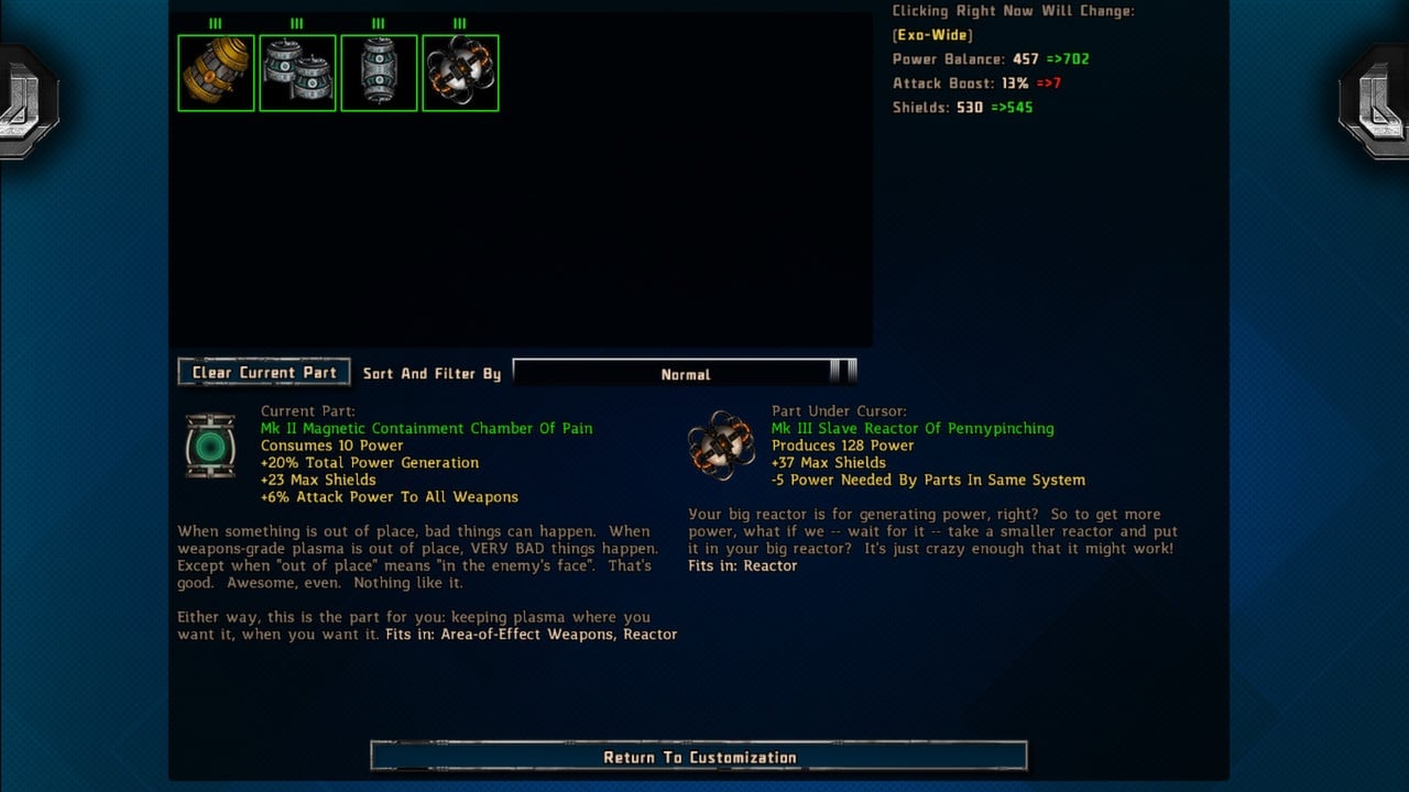 Из-за рандомной процедурной генерации локаций, врагов и ситуаций, геймер может пройти уникальный путь к финальному сражению. Количество уровней будет варьироваться в зависимости от случая. Одно прохождение потребует завершения 30 миссий, другое может растянуться на 120. Такая вариативность повышает интерес геймера к однопользовательской кампании и держит игрока в напряжении. Задания могут содержать до 23 целей, что рандомно располагаются в списке квестов при старте каждого этапа. Прокачка роботов выполнена с помощью выбора перков, которые влияют как на одного подопечного, так и на целый отряд. Также, важным является роль пилота, на которую нанимается один из шести предложенных вариантов.