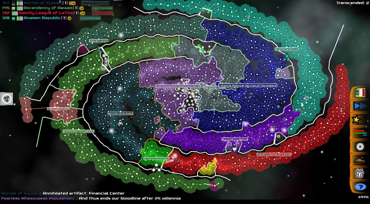 Важно понимать, что при контроле мощной империи просто отдать приказ к захвату недостаточно. Результат здесь будет складываться из последовательных действий, которые следует совершать без лишней спешки. Так, чтобы навязывать конфликты сторонним государствам, необходимо иметь достаточный боевой потенциал (в частности - мощный флот). Но постройки примитивных кораблей будет недостаточно - необходимо совершенствовать их, проводя исследования и открывая доступ к новым технологиям. Также, немаловажно расширять границы государства, захватывая звезды и обосновывая там постройки различного характера. А если сторонние империи нападают первыми, следует позаботиться об обороне, потратив ресурсы на возведение укреплений. Благодаря интерактивной карте и наличии отдельного цвета для каждого государства, можно понять, каков масштаб и потенциальная угроза того или иного поселения.