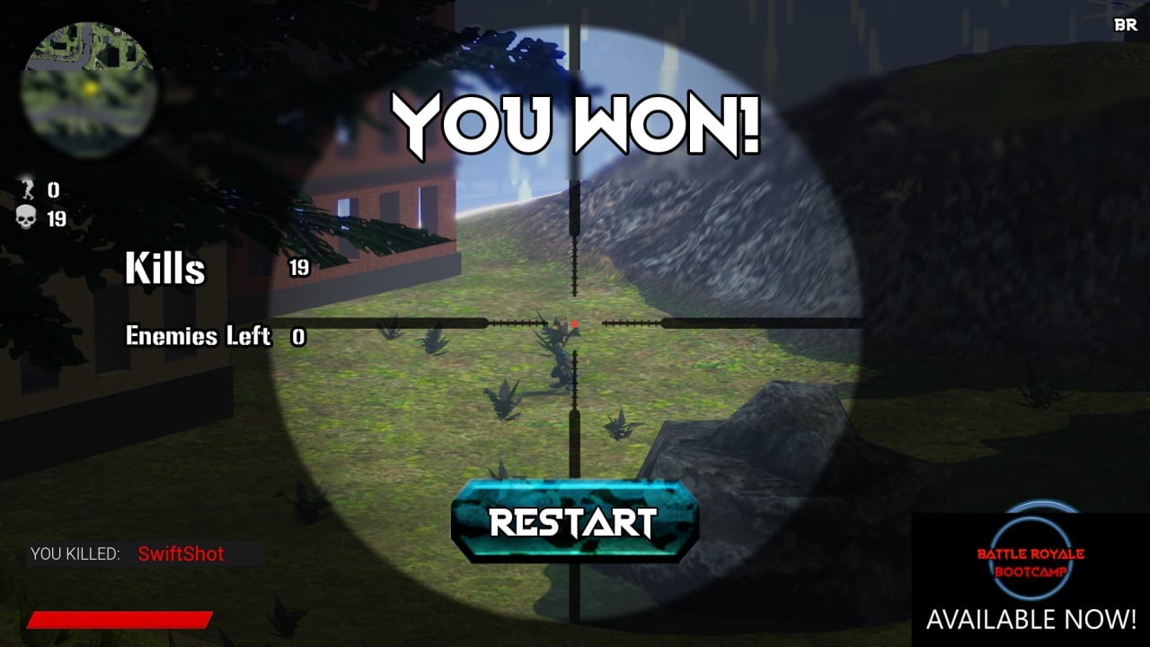 Задача крайне проста: остаться единственным выжившим в матче. Изучайте локации, используйте укрытия и здания, чтобы получить тактическое преимущество над врагом. Не дайте себя вычислить! Решает осторожность, точность и внимательность. Взяв врага на мушку, достаточно одного точного выстрела, чтобы убить соперника. Промахнувшись, есть шанс выдать себя, тем самым став мишенью для множества других игроков. Присутствует мини-карта, помогающая ориентироваться в пространстве и быстро принимать тактические решения.