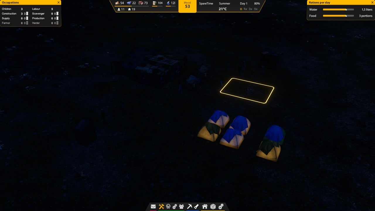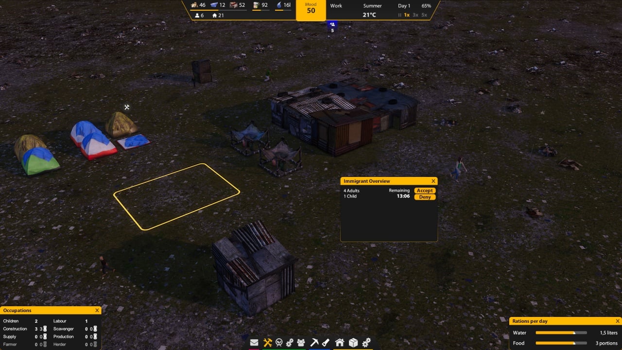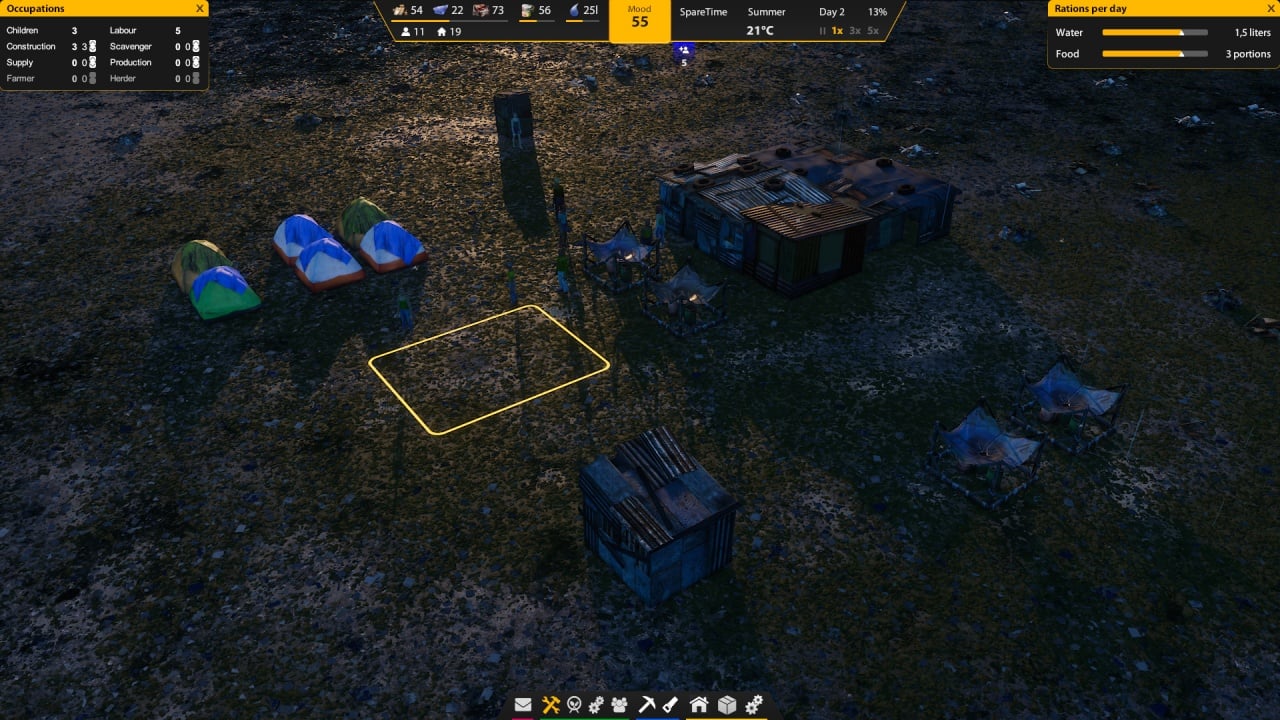 Игра, разработанная инди-коллективом "Crowbox", предоставляет игроку возможность попытаться уследить за всеми потребностями постоянно растущего лагеря. Людям постоянно необходимо иметь доступ к чистой воде, употребляемую во внутрь, обладать запасами еды для того, чтобы не быть подверженным болезням и для пополнения энергии после рабочего дня. Некоторые задания, выполняемые поселенцами, усложняются из-за погодных условий, которые могут рандомно сменяться. Солнечный день быстро переходит в пасмурную погоду, закат сменяется ночью, во время которой практически ничего не видно.